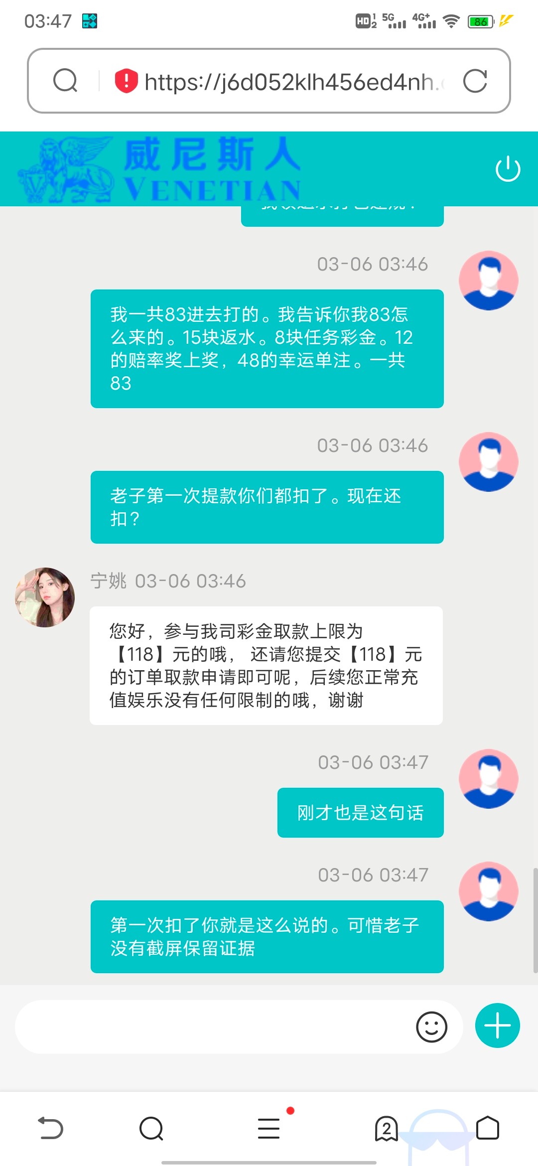 死垃圾平台,第一次签到得2块,打到300提现,说我账号异常涉嫌套利,让我充100加300余额一起打3倍流水然后正常出款,我充了。打了2000多流水。打到700提现。直接把我账户里的钱扣完还剩288,说什么彩金最多只能出款288,操签到2块钱。老子还充了一百呢。只提了288,还跟我说后续可以正常存取款了,这里我认了。然后领返水15+电子任务8+幸运单注48+赔率奖上奖12。这些都是说一倍流水出,几分钟我又打到了700。又提现。这次好了直接给我扣得还剩118,又他妈说什么一大堆废话。操他妈的垃圾平台