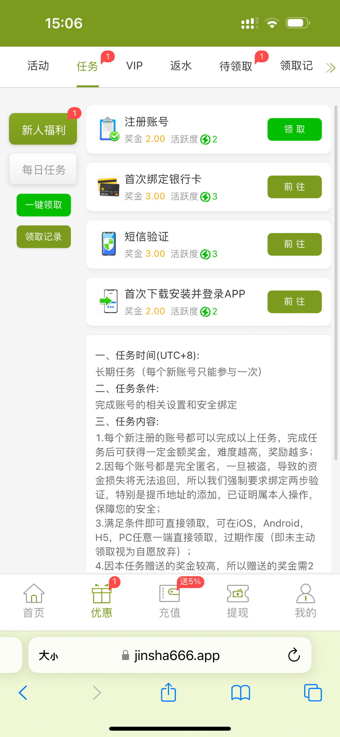 新户注册下载app完成新手任务秒送10/100提现。勿充值。