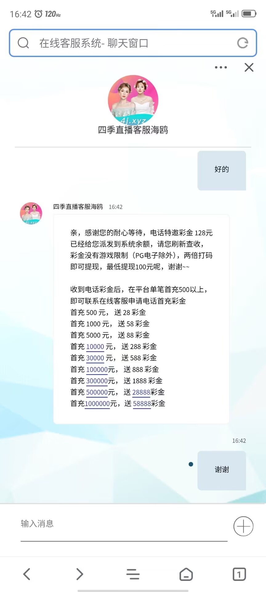 碰瓷特邀,新用户下载APP发手机号客服查询看看是不是特邀秒送128/2倍流水100提,没碰到的无视,彩金不能玩PG,其他都可以,链接打不开的找客服拿下载地址。