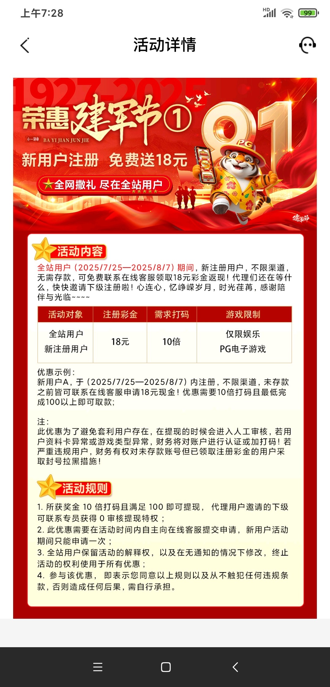 【开元91】建军节注册送18