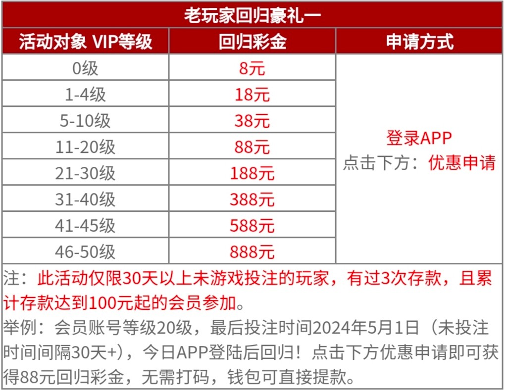 此活动仅限30天以上未游戏投注的玩家,有过3次存款,且累计存款达到100元起的会员才能参加,没有充值过的可以看别的贴子了。