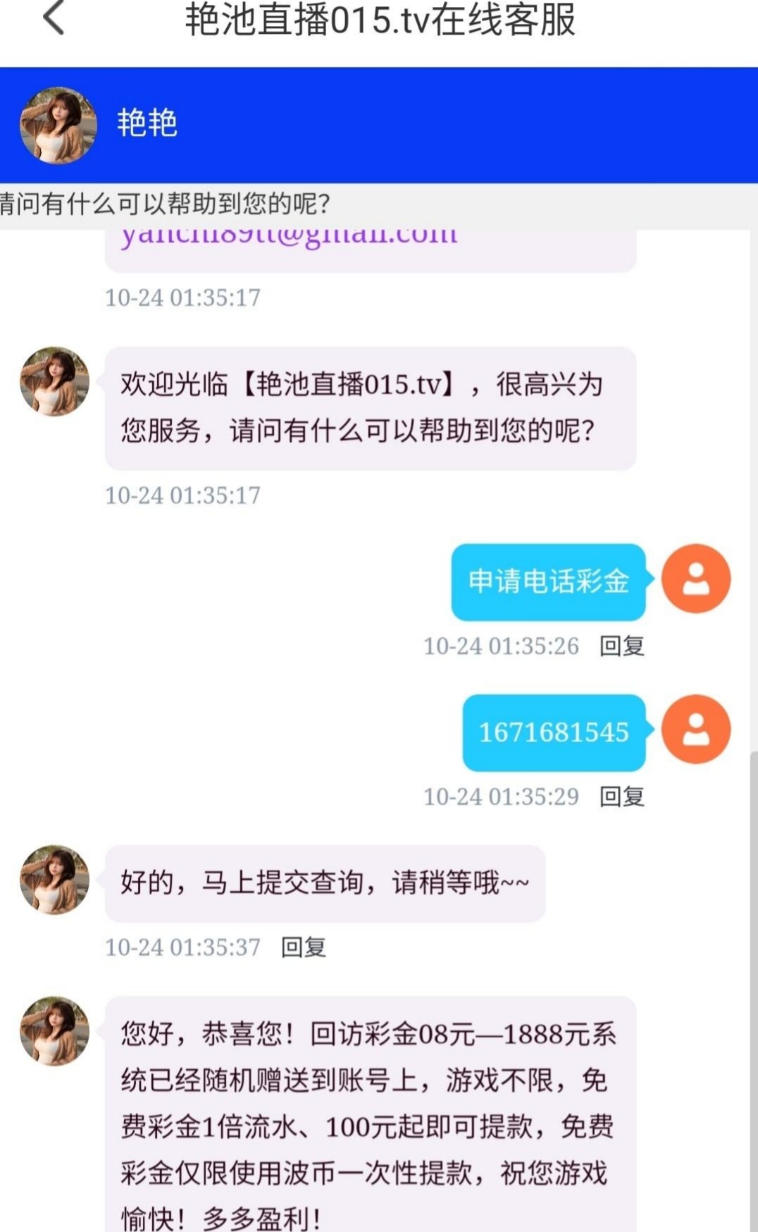 有号的找在线客服申请电话彩金领了好几次了 4866.tv