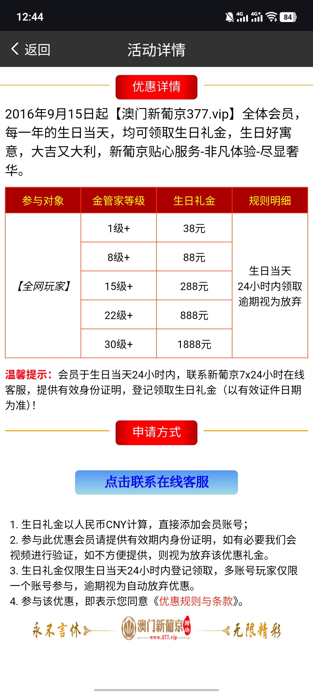 历史充值娱乐过 等级满vip1的生日当天 即可申请 最低派送38彩金