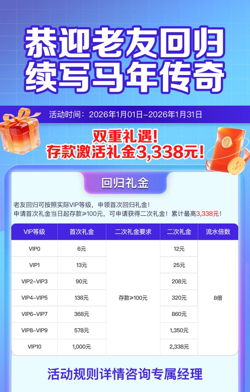 刚接到电话了,找专属客服登记领彩金。官网活动里的王者回归没领记得领。