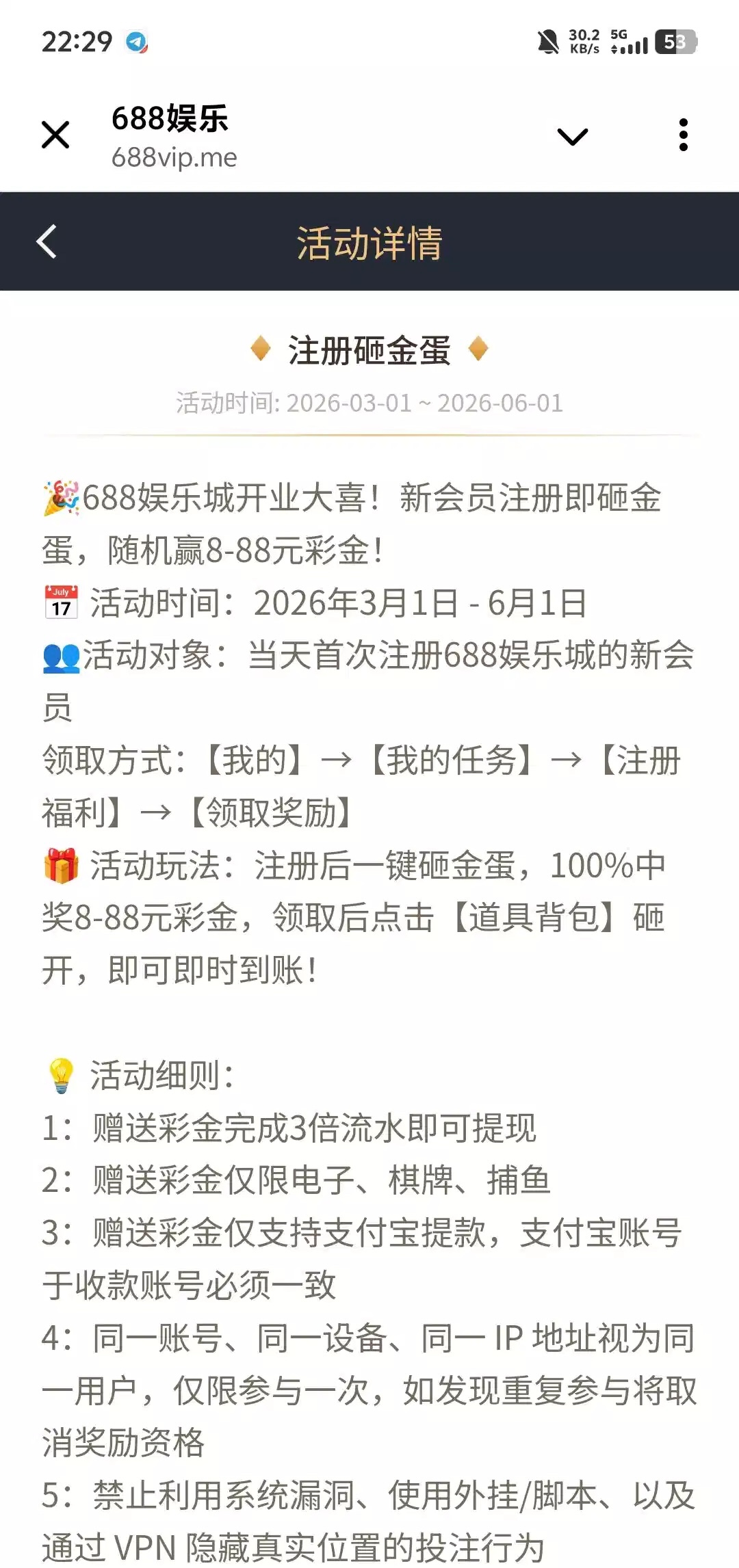 3倍流水即可提款,注册送8-88彩金,满100提款,只能提支付宝链接http://688vip.me