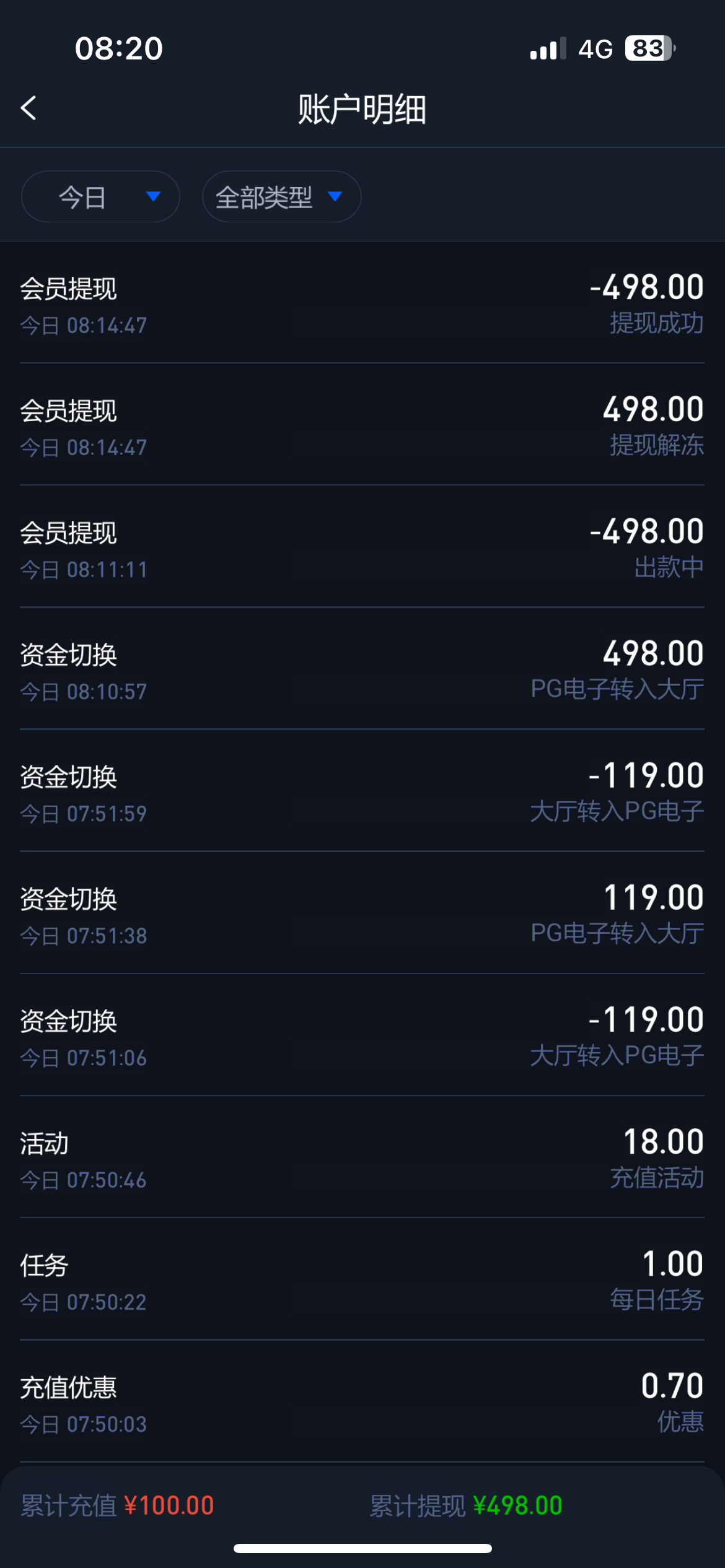 卧槽她妈,打到200下了。五六个小时不出款,然后账号异常封了